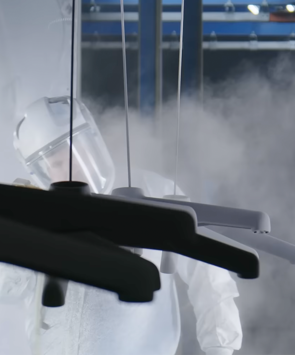 Metallteile werden in der Originalfarbe des Rahmens lackiert, um den Stuhl in einen absolut neuwertigen Zustand zu versetzen. Für ein langlebiges, haltbares Ergebnis verwenden wir, wenn möglich, Pulverbeschichtung.